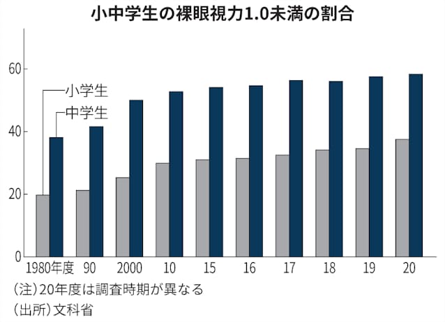 今回の調査では児童・生徒約334万人の視力も調べた。裸眼視力が1.0未満だった小学生の割合は37.5%で、前年度から約2.9ポイント増えた。約0.8ポイント増えた中学生(58.2%)とともに、いずれも過去最悪の割合となった。